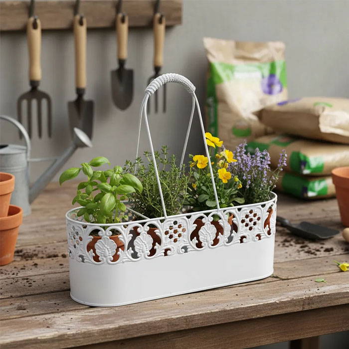 Transforma tu espacio con este Macetero Decorativo Metálico, un elemento que combina funcionalidad y estilo. Con unas dimensiones de 36x12x15 cm y asa de 20 cm, este macetero rectangular es ideal para exhibir tus plantas favoritas, aportando un toque moderno a cualquier ambiente.