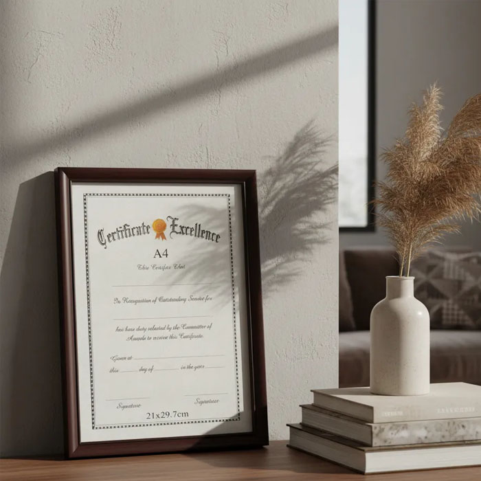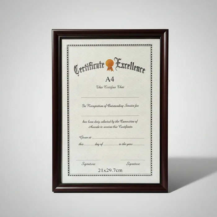 Presentamos el Marco Para Certificado Diploma Título Documento A4 en un elegante color marrón oscuro. Este diseño liso y sofisticado es ideal para resaltar tus logros académicos y profesionales, convirtiendo cualquier espacio en un lugar de orgullo y distinción. Con unas dimensiones de 21×29.7 cm, se adapta perfectamente a tus certificados y diplomas, asegurando que cada detalle sea visible y apreciado.