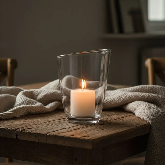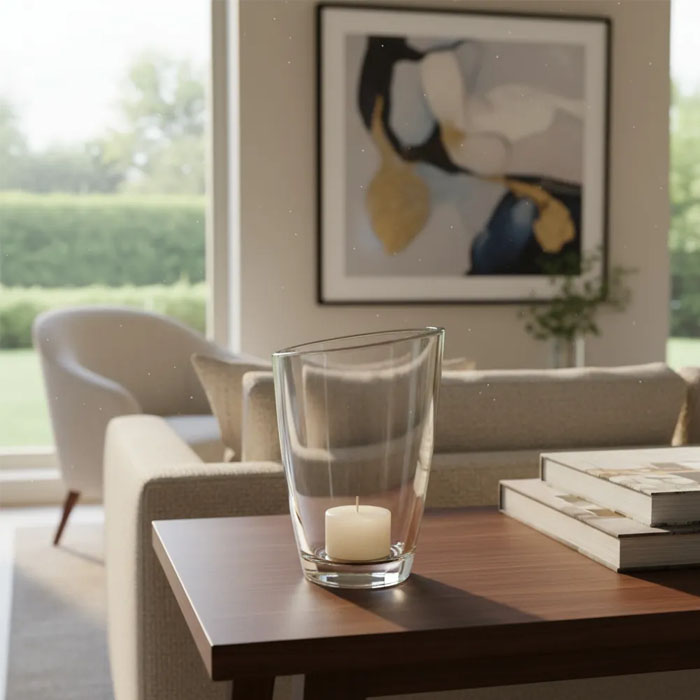 Fabricado en vidrio de alta calidad, su acabado brillante resalta la luz de las velas, creando un ambiente cálido y acogedor. Su estilo moderno se adapta perfectamente a diversas decoraciones, desde minimalistas hasta más elaboradas, aportando un toque de sofisticación.