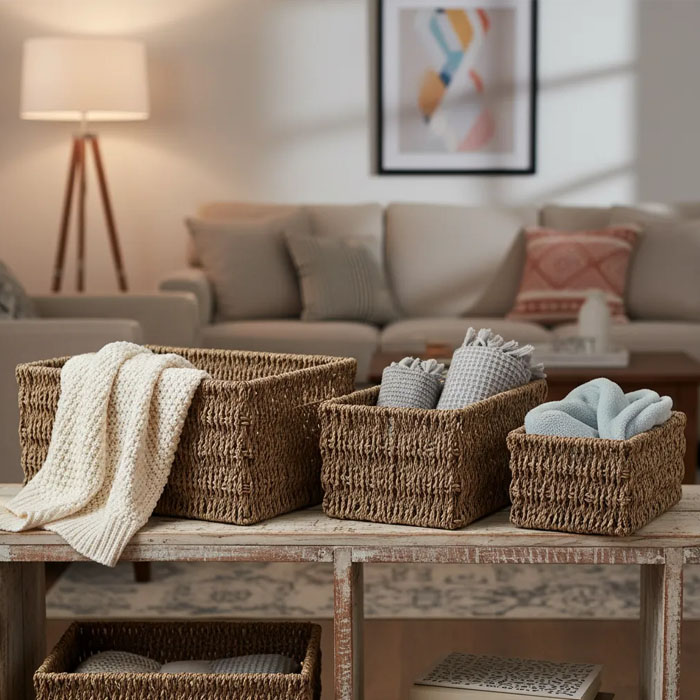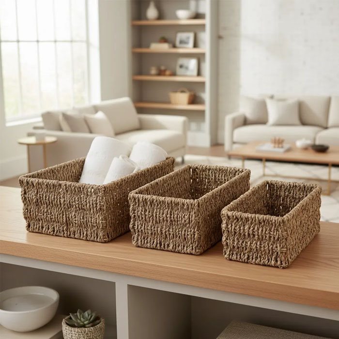 Su forma rectangular se adapta perfectamente a estanterías y rincones. Están fabricados en seagrass, un material resistente y ligero. Perfectos para quienes buscan una opción de almacenamiento que combine elegancia y practicidad, estos canastos son una adición esencial para cualquier hogar.